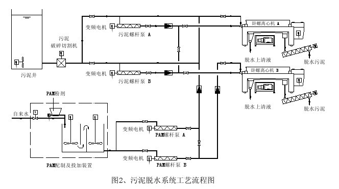 NOXON 臥螺離心脫水機的整體集成性能優良,絮凝劑投加裝置、絮凝劑泵、污泥泵等均隨離心機配套供應,在自控系統的支持下,組成了一個有機整體,其工藝流程如圖 2 所示。