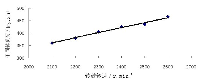 所謂干固體負荷是指每小時處理的不揮發固體重量,以 KgDS(干污泥)/h 表示。調整離心機的干固體負荷,對污泥脫水效果有很大影響,當進泥流量(即“水力負荷”)達到一定程度,所帶入的懸浮物含量超過了離心機所能承受的最大干固體負荷時,會造成泥餅含水率增加,上清液帶泥增多,此時應該減少進泥流量,使離心機脫出的上清液清澈在實際運行中,必須通過調整水力負荷,來保證進入離心機干固體負荷不超過離心機的最大承受能力,否則,多余的干固體將從上清液中排出,上清液的懸浮物會急劇增多,但脫水泥餅的產量并沒有增加。該廠使用的離心機,當轉鼓轉速為 2300rpm、進泥濃度為 35 g/L 時,離心機運行的干固體負荷可達 405kg/h。當離心機磚鼓轉速增加時,干固體負荷也會相應增加,圖 3 是最大干固體負荷隨離心機轉鼓轉速變化的曲線。