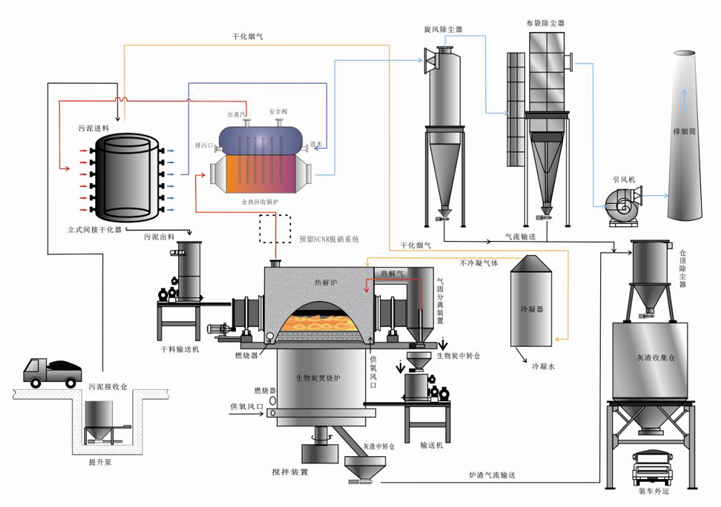 3、污泥進(jìn)入熱解爐進(jìn)行熱解,熱解后生物炭進(jìn)入生物炭焚燒爐提取可用熱量,混合氣進(jìn)入熱解爐膛燃燒,從熱解爐引來的燃燒后熱煙氣進(jìn)入余熱回收裝置,產(chǎn)生蒸汽迅速返回至間接干化器夾層,通過間接加熱對污泥進(jìn)行干化,干化后蒸汽變?yōu)闊崴赜茫L(fēng)機(jī)抽出的煙氣經(jīng)尾氣處理系統(tǒng)清潔凈化后,達(dá)標(biāo)排放;