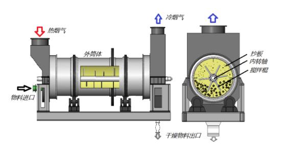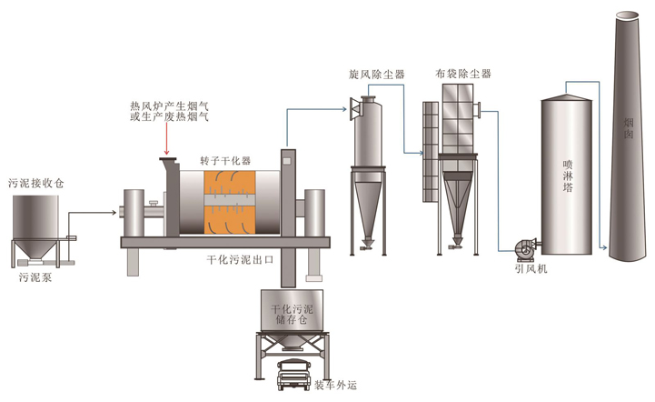 2.脫水污泥被輸送至轉(zhuǎn)子干化器,通過直接與熱煙氣接觸,在干化器內(nèi)實(shí)現(xiàn)加熱和干化;經(jīng)干化后的物料進(jìn)入干化污泥儲存?zhèn)}后外運(yùn)再利用;